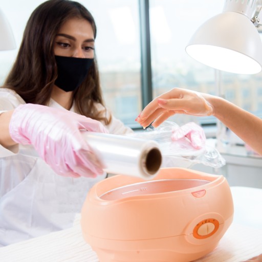 Rozpuść parafinę w parafiniarce. W między czasie wykonaj peeling skóry, aby usunąć martwy naskórek. Zanurz dłonie lub stopy w ciepłej parafinie minimum 2 razy. Załóż foliowe rękawiczki oraz rękawice frotte i pozostaw na 20 minut. Usuń parafinę i ciesz się gładką, odżywioną skórą!