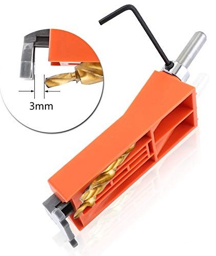 Skala linijki. Przyrząd do osadzania kołków służy do ograniczania długości wiertła, wygodnego i szybkiego. Przyrząd do wiercenia otworów z magnesem pozwala mocniej zacisnąć zacisk C, nie poślizguje się podczas wiercenia. Przyrząd do drewna wykonany jest z tworzywa ABS, odpornej na zużycie metalowej tulei wiertarskiej, lekkiej, bez rdzy, bardziej trwałej. Zestaw przyrządów z kieszonkowym otworem, idealny do domowych projektów dla majsterkowiczów lub do profesjonalnych zastosowań komercyjnych. Używaj z zaciskami i wiertłami C (brak w zestawie), aby stworzyć idealne otwory do obróbki drewna, lub naprawić połączenia drewniane. Podwójny otwór na wióry trociny można łatwiej usunąć z przyrządu do dziurkowania.