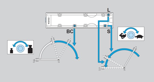- Regulowana szybkość zamykania drzwi, szybkość zatrzaskiwania oraz regulacja funkcji back-check poprzez regulację frontowych zaworów