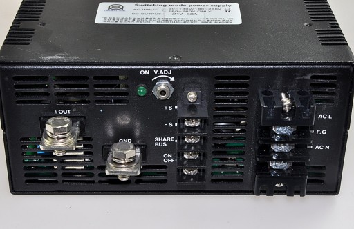 Nowy, nigdy nie używany, całkowicie sprawny zasilacz impulsowy do zastosowań w przemyśle. Symbol urządzenia: AP 15K-24, produkt koreańskiej firmy: a-PRO CO., LTD. Zasilanie jednofazowe napięciem zmiennym 230V 50Hz, zasilacz na wyjściu oferuje napięcie stałe 24V z imponującą wydajnością prądu do 63A. Posiada potencjometr umożliwiający korekcję napięcia wyjściowego oraz dodatkowe wejścia do zdalnej kontroli i sprzężenia zwrotnego pomiaru napięcia np na odbiorniku, co zapewnia lepszą kontrolę parametrów pracy.