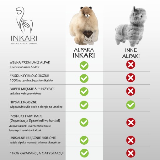 WEŁNA Z ALPAKI: jest bardziej miękka niż kaszmir, cieplejsza niż wełna merynos, lekka niczym piórko a zarazem niesamowicie wytrzymała, jest przyjazna dla środowiska i zwierząt, jest hipoalergiczna i nie podrażnia w kontakcie ze skórą.