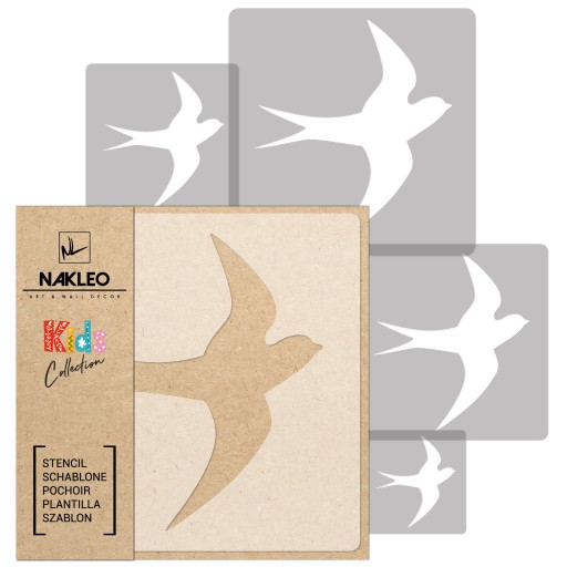 Nakleo Kids Collection to zestawy pięciu szablonów wykonanych z wytrzymałego tworzywa sztucznego składające się z arkuszy o wymiarach od 34x34cm do 9x9cm. Szablony można używać dowolną ilość razy dzięki czemu z łatwością pokryjesz nawet największe ściany dowolną kompozycją wzorów i kolorów. Daj się ponieść fantazji, spraw frajdę sobie i swojemu dziecku. Tylko klucz jaskółek? A może całe stado? To Ty decydujesz jak będzie wyglądać pokój Twojego dziecka, jedyne co zapewniamy to niezwykły efekt końcowy.
