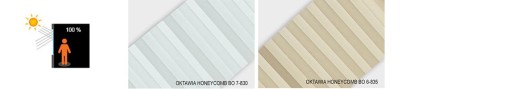 OKTAWIA oraz MALEZJA HONEYCOMB BLACKOUT - materiał połączony z dwóch plis. Tkanina "plaster miodu" harakteryzuje się mniejszymi załamaniami pliski. W przekroju przypomina plaster miodu. Dzięki specjalnej strukturze z mikroperforacjami i wewnętrzną aluminiową powłoką, wykorzystuje komory powietrzne do dodatkowej izolacji (dźwięku i ciepła) i tym samym podnosi parametry energetyczne okna. Latem ciepło nie przedostaje się do wnętrza pomieszczenia natomiast zimą ciepło z pomieszczenia nie jest wypuszczane. Ponadto honeycomb zwiększa estetykę wnętrza, pozwalając na umieszczenie mechanizmów sznurkowych i prowadnic wewnątrz tkaniny. Takie rozwiązanie również sprawie że nie ma prześwitów w miejscu dziurek na sznurki. Tkanina zaciemnia pomieszczenie w 100%.