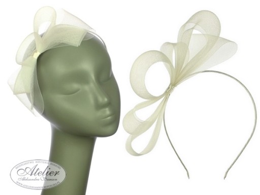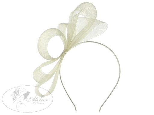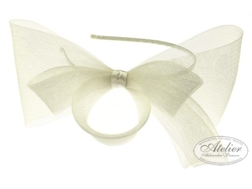 Satynowa opaska ozdobiona stroikiem z syntetycznej krynoliny. Opaska jest na metalowej podstawie, dzięki czemu można ją dopasować do kształtu głowy. Opaska bez ząbków. Jest to produkt szyty (nieprzyklejany).
