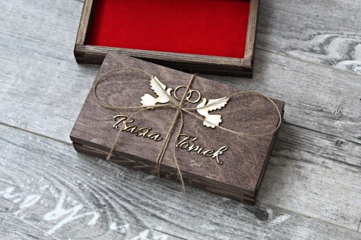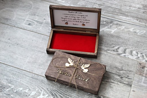 Drewniane pudełko pomalowane na kolor ciemnego drzewa(brąz). Ozdobione dekorem(gołąbki) i imionami wyłożone czerwonym filcem, z życzeniami.