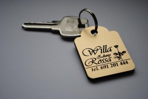 Brelok z laminatu grawerskiego PCV o grubości 3,2 mm.