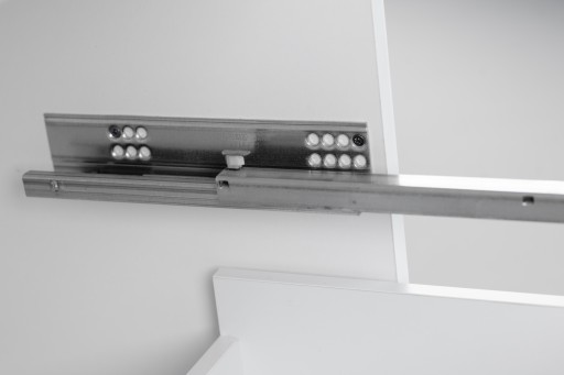 Zamontowany w prowadnicach przycisk za pomocą kliknięcia umożliwia szybki montaż i demontaż szuflad.