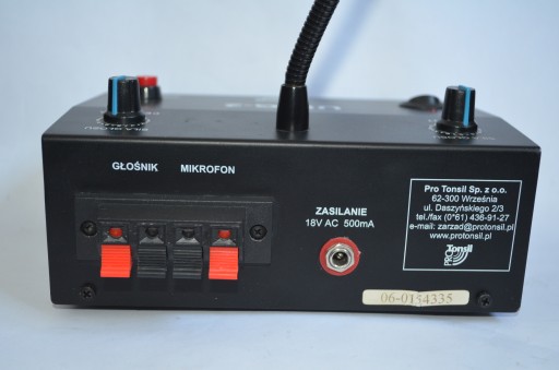 Na płycie tylnej są zaciski do podłączenia głośnika klienta i zaciski do podłączenia mikrofonu klienta, oraz wejście zasilania (18V 0,5A)