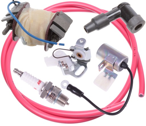 - W SKŁAD ZESTAWU WCHODZI: PRZERYWACZ ZAPŁONU, 1 METR PRZEWODU ZAPŁONOWEGO, ŚWIECA ZAPŁONOWA B7HNS F80, KONDENSATOR, FAJKA ZAPŁONOWA ORAZ CEWKA ZAPŁONOWA