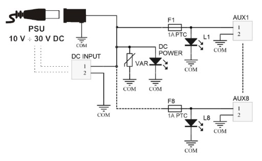 Zadziałanie bezpiecznika PTC sygnalizowane jest przez zgaszenie odpowiedniej diody LED modułu: L1 dla AUX1, L2 dla AUX2 itd. Dodatkowo wejście modułu zabezpieczone jest warystorem chroniącym zasilacz przed skutkami wystąpienia przepięć w układzie zasilania.