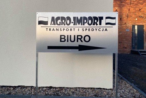 Szyld reklamowy z dibondu na konstrukcji metalowej malowanej na czarno do samodzielnego montażu.