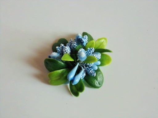 Przypinka wykonana jest z kolorowych dodatków florystycznych i zielonych listków.