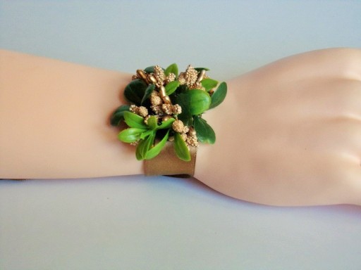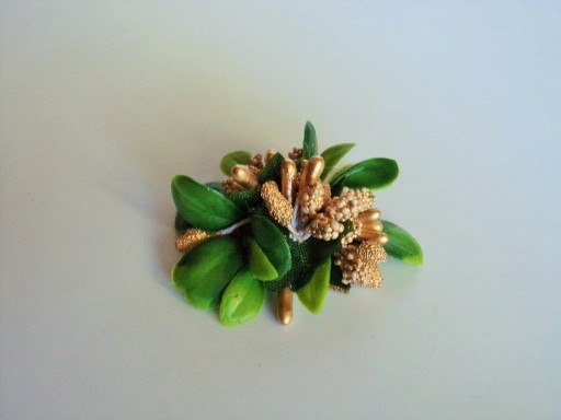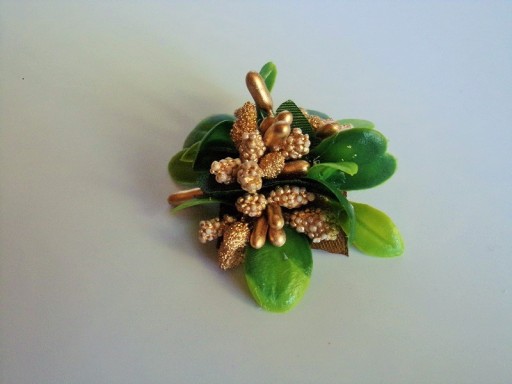 Przypinka wykonana jest z kolorowych dodatków florystycznych i zielonych listków.