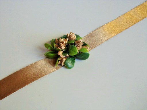 Na rękę wiązany jest za pomocą satynowej tasiemki o szerokości 25mm i długości ok. 40cm.