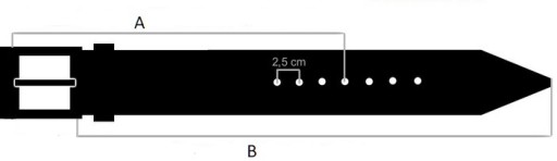 Rozmiar to po prostu twój obwód w pasie. W naszych paskach jest to obwód paska zapiętego na środkową dziurkę (parametr A na rys. poniżej). Jeśli masz np. około 100 cm w pasie to odpowiedni dla ciebie będzie właśnie rozmiar 100. Jest to oczywiście 100 cm na środkowej dziurce, więc jest przewidziana tolerancja o 7,5 cm w tył i 7,5 cm w przód. Pasek posiada 7 dziurek co 2,5 cm.