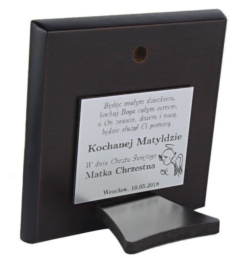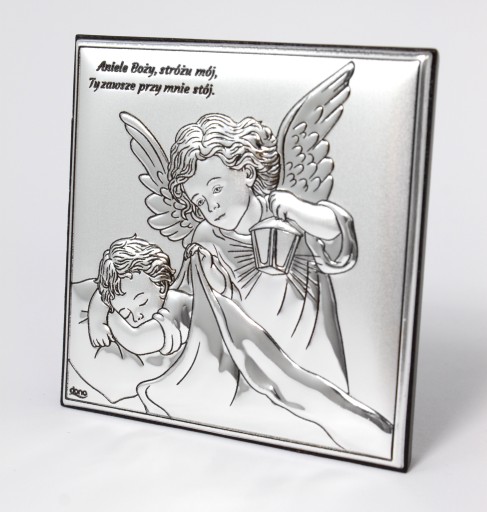 Pamiątka włoskiej firmy przedstawiająca wizerunek Aniołka z latarenką czuwającego nad dzieciątkiem . Całość została zamknięta w kształcie klasycznego kwadratu z napisem Aniele Boży, stróżu mój, Ty zawsze przy mnie stój.