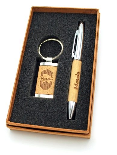 Ekologiczny zestaw upominkowy składający się z długopisu oraz breloka wykonanych z metalu i drewna.