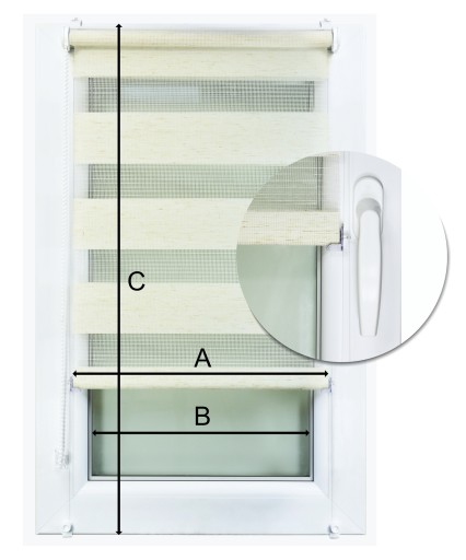 - Należy pamiętać, że roleta powinna być nieco szersza od szyby, ale nie może zasłaniać klamki. Zalecany minimalny odstęp tkaniny od klamki to 0,5 cm.Wysokość rolety:Zmierz wysokość skrzydła okna (C). Jeżeli okno ma wysokość 150 cm lub mniej, należy wybrać roletę o długości 150 cm. Tolerancja wynosi 0,5 cm.