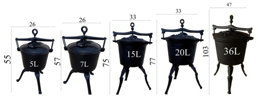 Dostępne są różne pojemności kociołków, od takich nieprzekraczających 5l, przez 7, 10 czy 20l, aż po 36-litrowe naczynia,