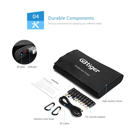 Zawartość opakowania: 1 x przenośna ładowarka solarna Pack, 10 x adapter transferowy, 1 x kabel DC, 2 x haczyk przymocowany, 1 x angielski podręcznik użytkownika