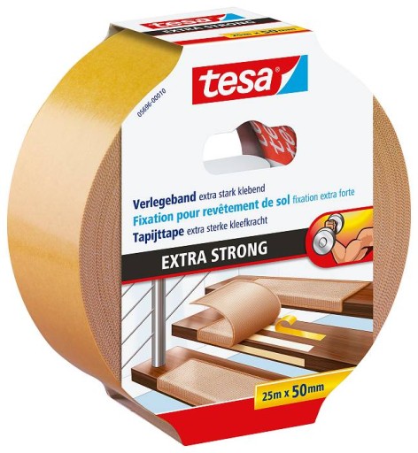 Profesjonalna taśma podłogowa tesa® Extra Strong Hold o wymiarach 25 m x 50 mm (dł. x szer.) przeznaczona do zastosowań wewnętrznych i zewnętrznych jest wysokiej jakości dwustronnie samoprzylepnym produktem umożliwiającym wieloletnie mocowanie wszelkich rodzajów wykładzin, dywanów oraz pokryć PVC, także charakteryzujących się potrzebą intensywnego użytkowania. Taśma podłogowa tesa® Extra Strong Hold cechuje się: