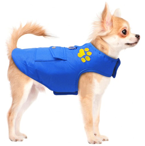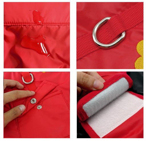 Na pleckach przyszyte zostało metalowe kółko ,do którego można zapiąć smycz oraz kieszonka.