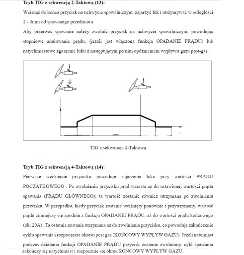Zarówno przy zapłonie bezdotykowym HF jak i dotykowym LIFT mamy możliwość wyboru funkcji przycisku w uchwycie TIG pomiędzy pracą w trybie 2-takt lub 4-takt (blokada przycisku do długich spoin).