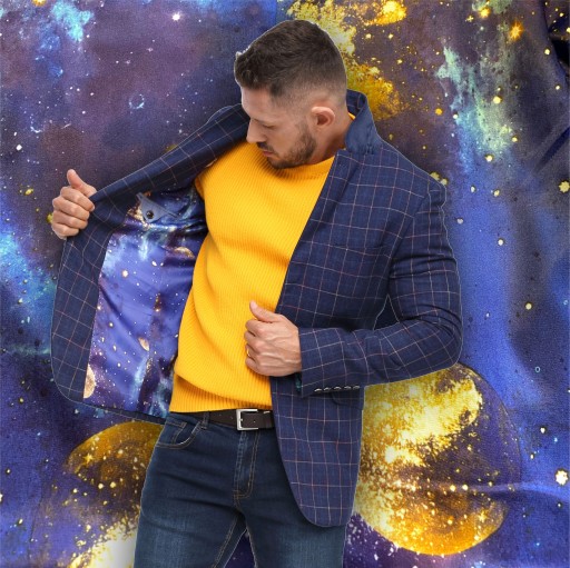 - Całość projektu marynarki podkreślają guziki i niezwykła gwiezdna podszewka.