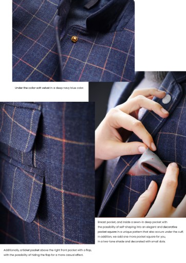 - Dwie poszetki w kieszonce marynarki: wszyta casualowa z motywem lasu oraz dodatkowa elegancka biznesowa
