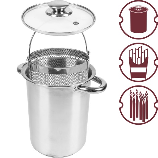Uniwersalny, wielofunkcyjny garnek z koszem, pokrywką i szynkowarem do 1,5 kg - do parzenia szynek, smażenia frytek, do gotowania makaronu, spaghetti, szparagów - stal nierdzewna, 4 L