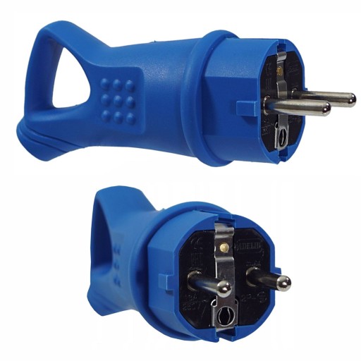 Oryginalna wtyczka gumowa marki Adelid 16A 2P+Z, z uchwytem, w kolorze niebieskim.