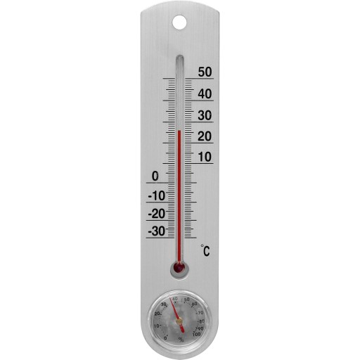 - Czytelna duża skala - ułatwia szybki odczyt temperatury temperatury (od -30°C do +50°C). Znajdujący się pod termometrem okrągły higrometr pozwala na odczyt wilgotności powietrza (od 0% do 100% RH).