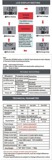 Na wyświetlaczu regulatora można obserwować bieżące napięcie ładowania akumulatorów oraz ustawić/wybrać tryb pracy z akumulatorami żelowymi, kwasowymi i AGM jak również ręcznie zaprogramować nastawy napięć załączania wyjścia i oraz czas załączenia wyjścia po zmroku.