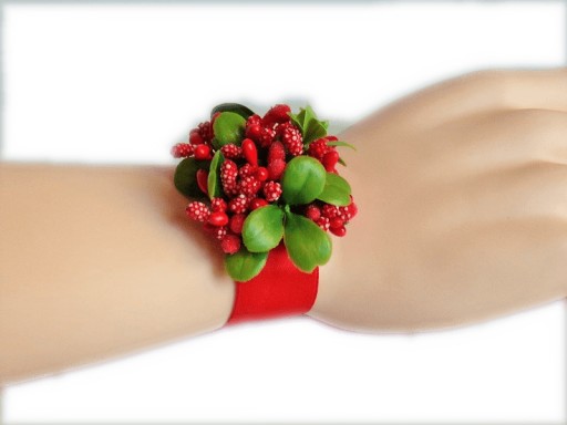 Na rękę wiązany jest za pomocą satynowej tasiemki o szerokości 25mm i długości ok. 40cm.