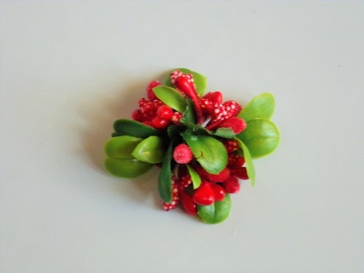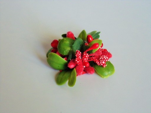 Bukiecik wykonany jest z kolorowych dodatków florystycznych i zielonych listków.