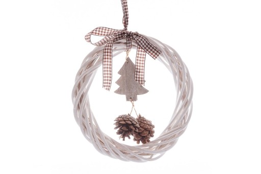 Wieniec świąteczny do zawieszenia wykonany z ratanu w kolorze białym.