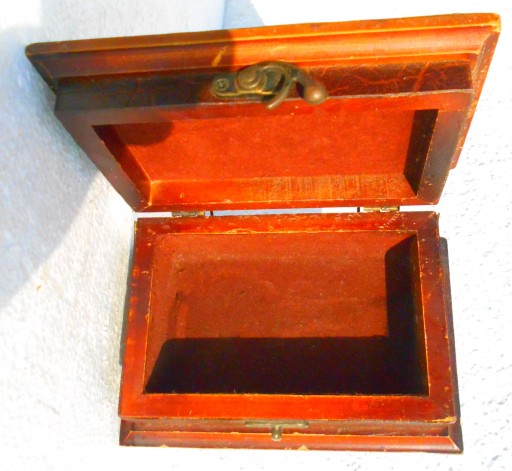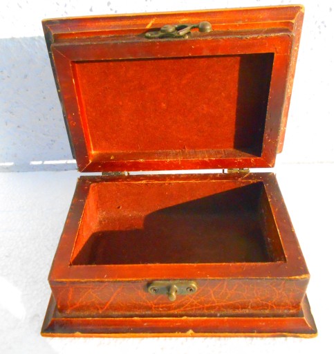 Szkatua drewniana, stara, z okuciami, wyściełana, oryginalne zamknięcie