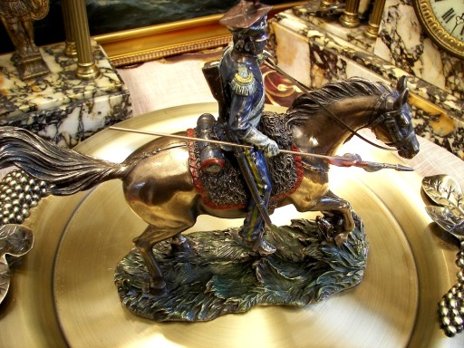 Zapraszam do zakupu wspaniałej figurki przedstawiającej ułana polskiego na koniu z lancą. Przedmiot wykonany z materiału typu poliresin, to mieszanina żywicy i kamienia .