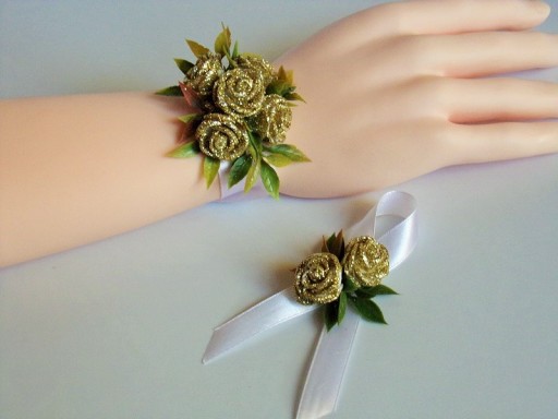 Na innej aukcji dostępne są pasujące do przypinek bukieciki na rękę dla pań.