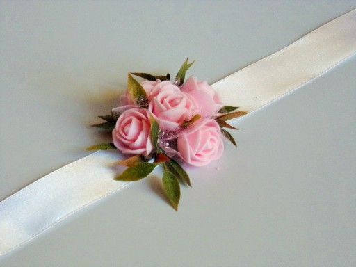 Na rękę wiązany jest za pomocą białej satynowej tasiemki o szerokości 25mm i długości ok. 40cm.