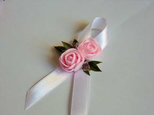 Przypinka wykonana jest z piankowych różyczek, zielonych listków i białej satynowej wstążki o szerokości ok. 12mm.