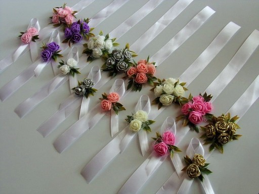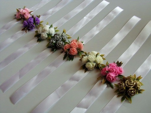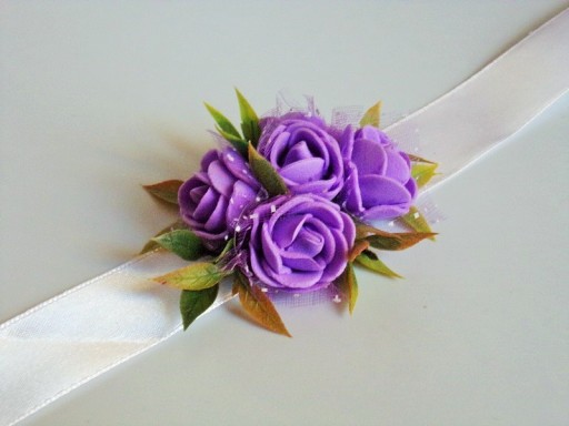Na rękę wiązany jest za pomocą białej satynowej tasiemki o szerokości 25mm i długości ok. 40cm.
