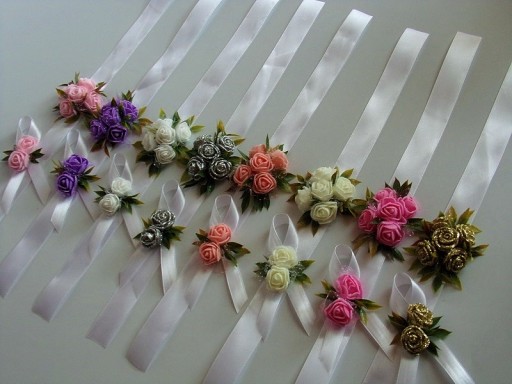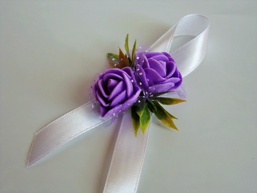 Przypinka wykonana jest z piankowych różyczek, zielonych listków i białej satynowej wstążki o szerokości ok. 12mm.