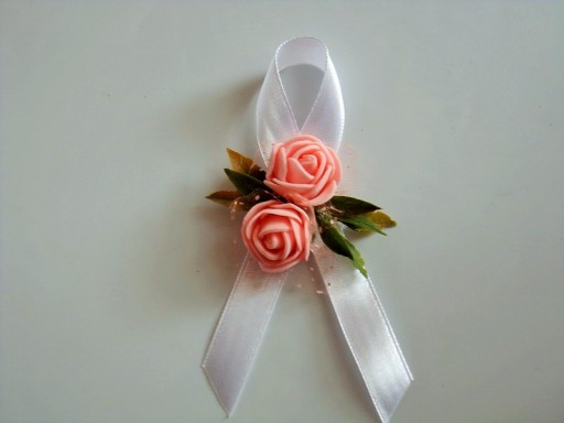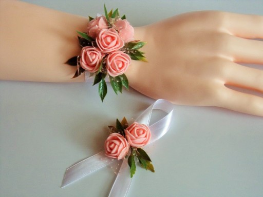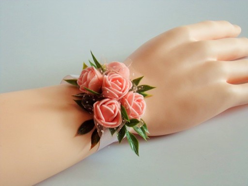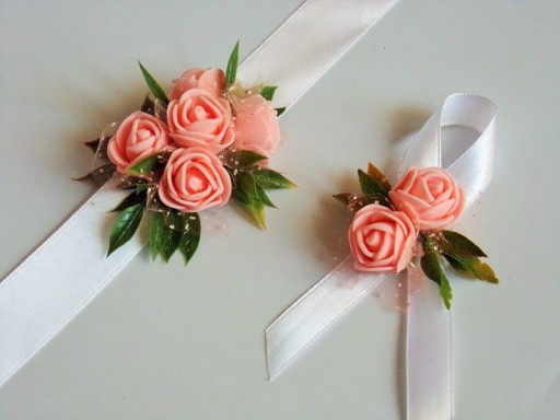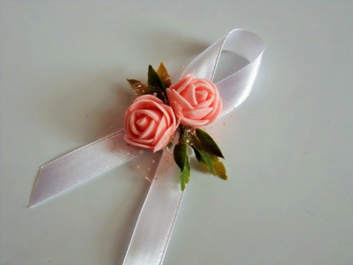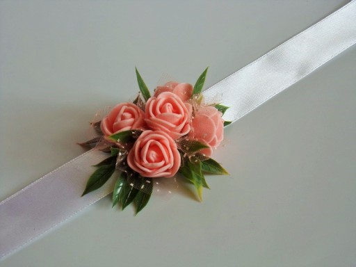Na rękę wiązany jest za pomocą białej satynowej tasiemki o szerokości 25mm i długości ok. 40cm.