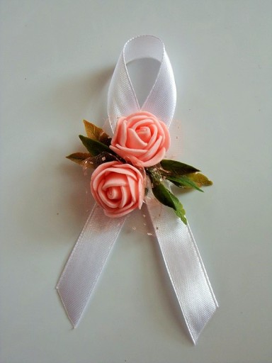 Przypinka wykonana jest z piankowych różyczek, zielonych listków i białej satynowej wstążki o szerokości ok. 12mm.