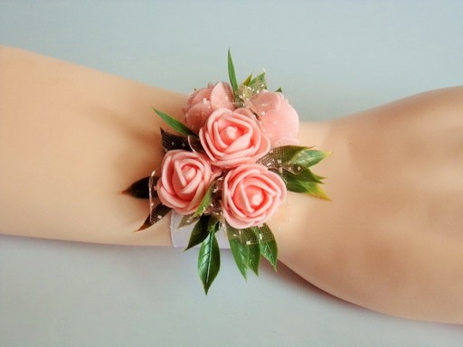 Na innej aukcji dostępne są pasujące do przypinek bukieciki na rękę dla pań.