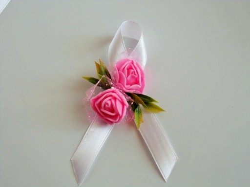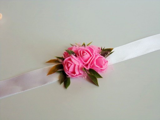 Na rękę wiązany jest za pomocą białej satynowej tasiemki o szerokości 25mm i długości ok. 40cm.