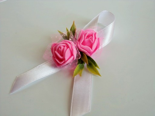 Przypinka wykonana jest z piankowych różyczek, zielonych listków i białej satynowej wstążki o szerokości ok. 12mm.