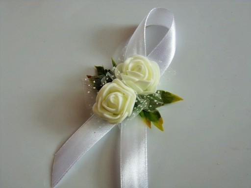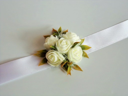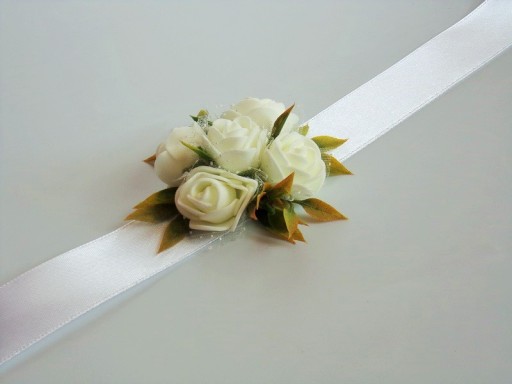 Na rękę wiązany jest za pomocą białej satynowej tasiemki o szerokości 25mm i długości ok. 40cm.