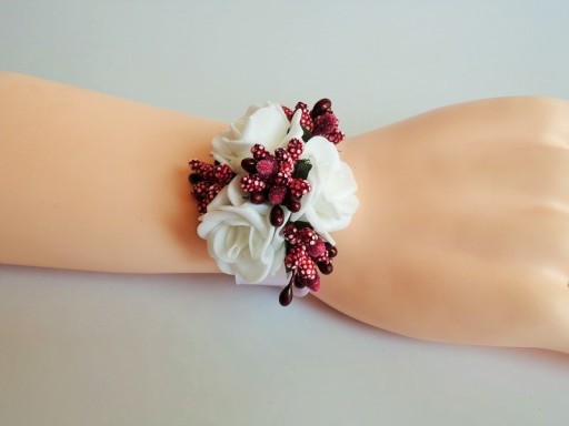 Na innej aukcji dostępne są pasujące do przypinek bukieciki na rękę dla pań.